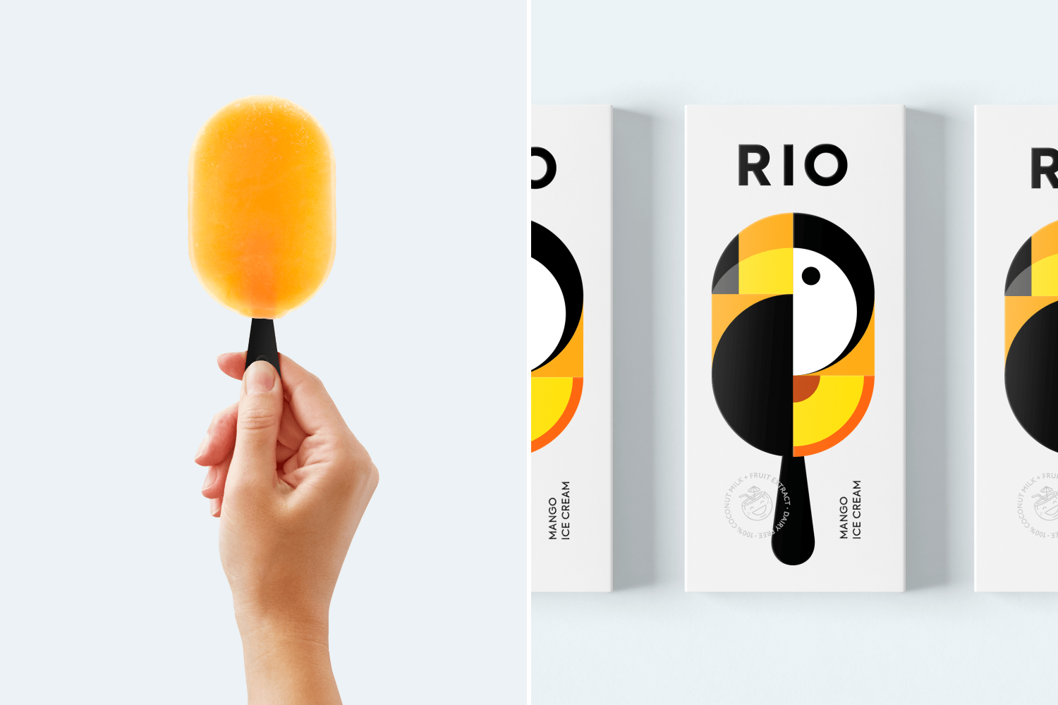冰淇淋概念的靈感來自世界上色彩最豐富的城市之一里約熱內盧。RIO冰淇淋反映了這座城市的主要特征明亮美味和陽光明媚。美麗的巨嘴鳥鳥也使我們想起了里約熱內盧的主要吉祥物。包裝的主要思想是傳達其美味的味道及其天然成分,簡單的圖形成獨特的識別符號,加速人們的聯想,使人印象深刻。